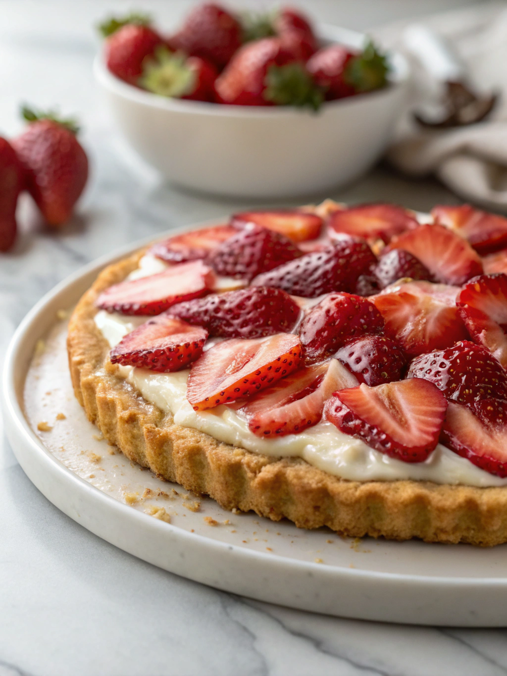 Absolutely! While strawberries are the star of this recipe, you can swap them for blueberries, kiwi, raspberries, or even a mix of your favorite fruits. Just make sure they’re fresh and well-drained to avoid a soggy crust.